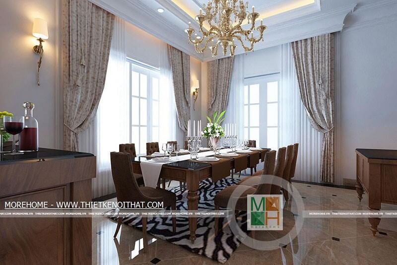 Tạo ra một không gian liền phòng ăn trong biệt thự, nhà phố bằng cách thiết kế nội thất phòng khách theo phong cách tân cổ điển sang trọng, giúp tạo nên sự cao cấp và ấn tượng.